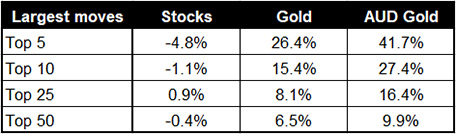 Average returns from largest monthly moves in stocks and gold 1971 to 2022