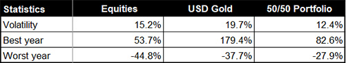 This can be seen in the table below, which also highlights the fact golds best year performance wise is much better than equities best year, while its worst year saw a smaller correction.