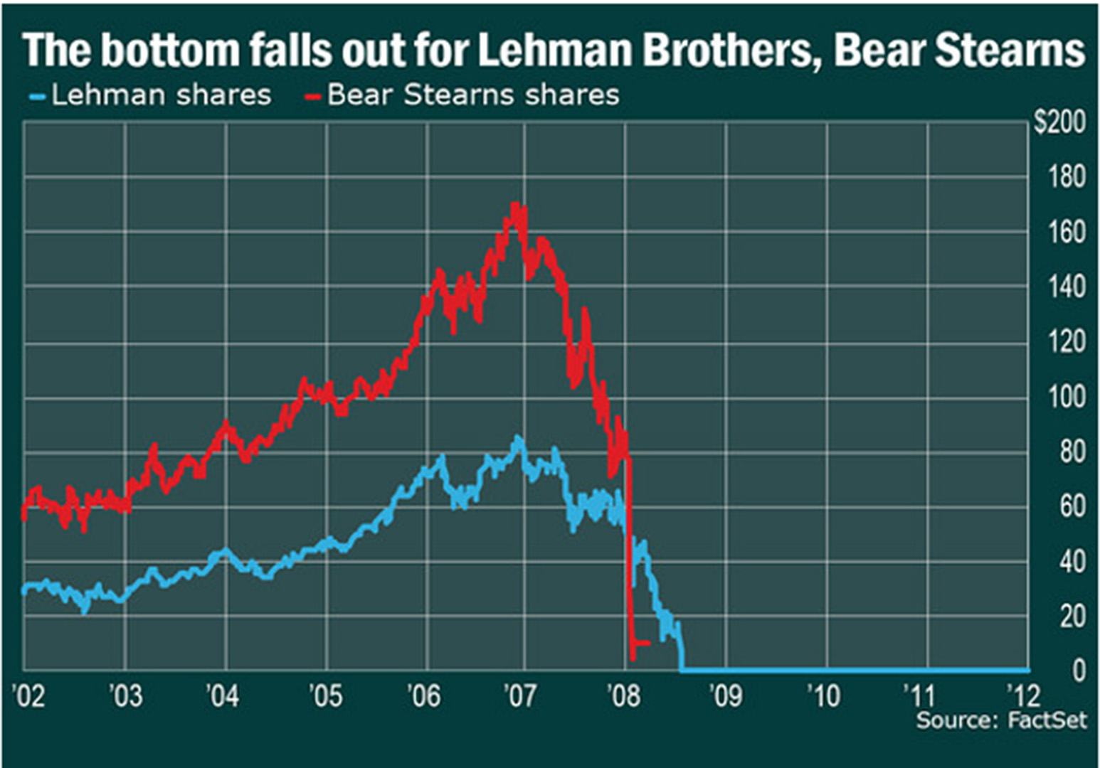 For example, consider the chart below, which displays the share prices of Bear Stearns, and Lehman Brothers, two of the highest-profile failures from the Global Financial Crisis.